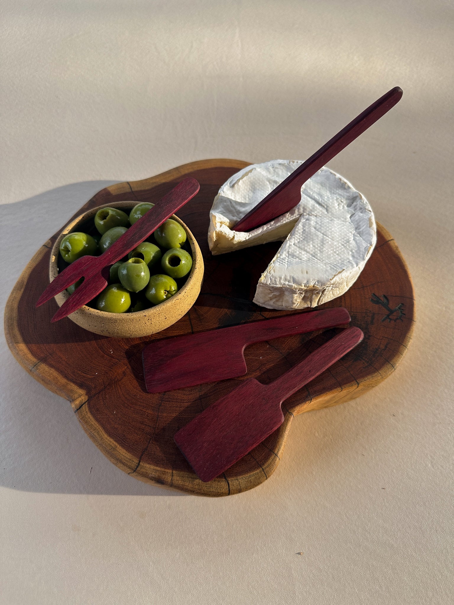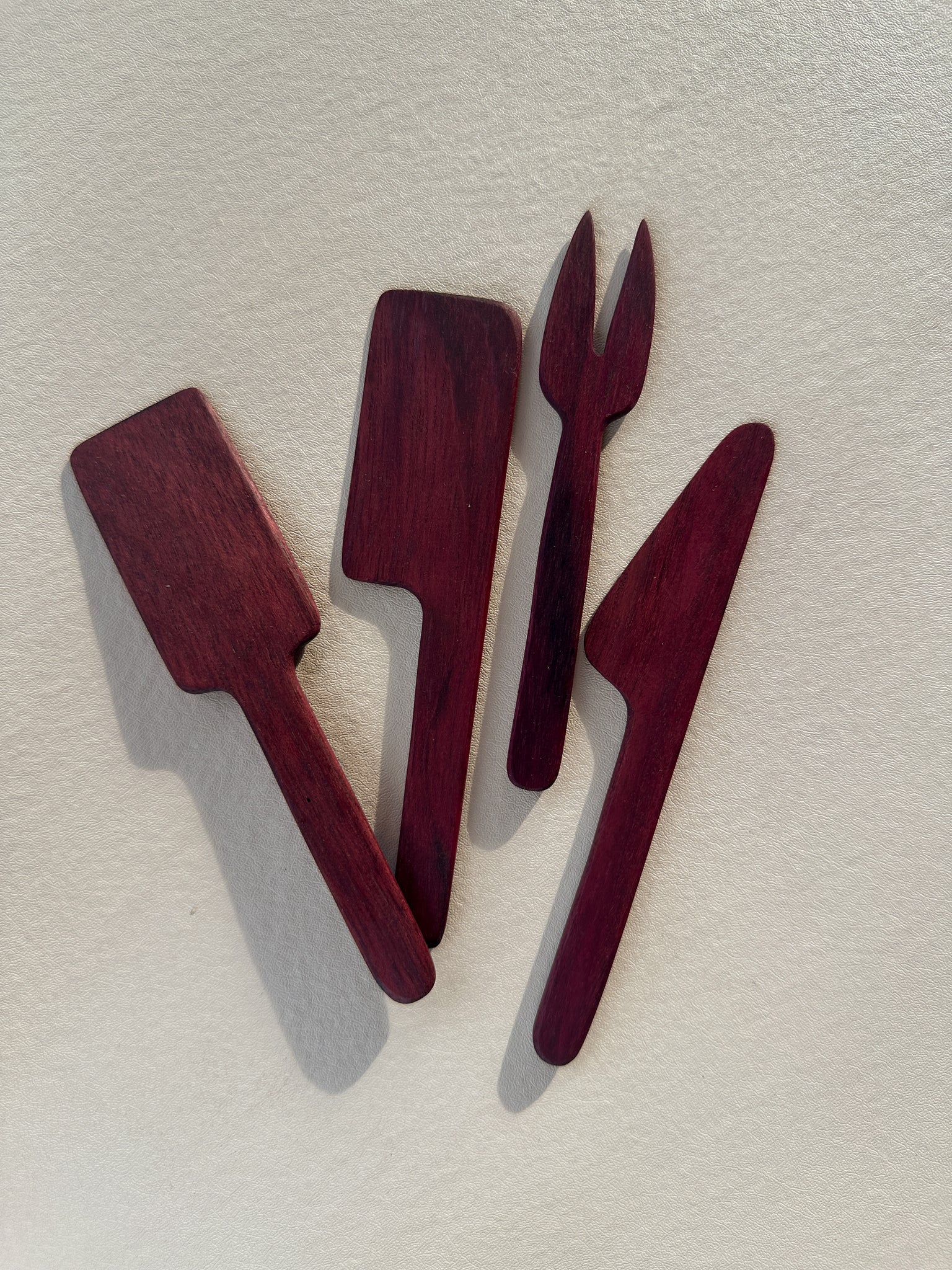 A beautiful set of charcuterie utensils made of purple heart. The set includes one cocktail fork and three cheese slicers. Each piece has been hand crafted and is truly unique.