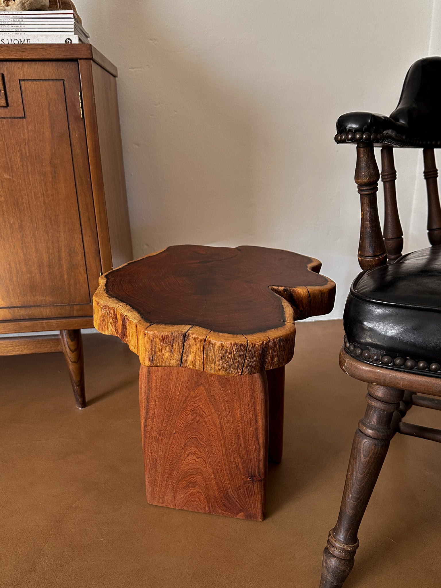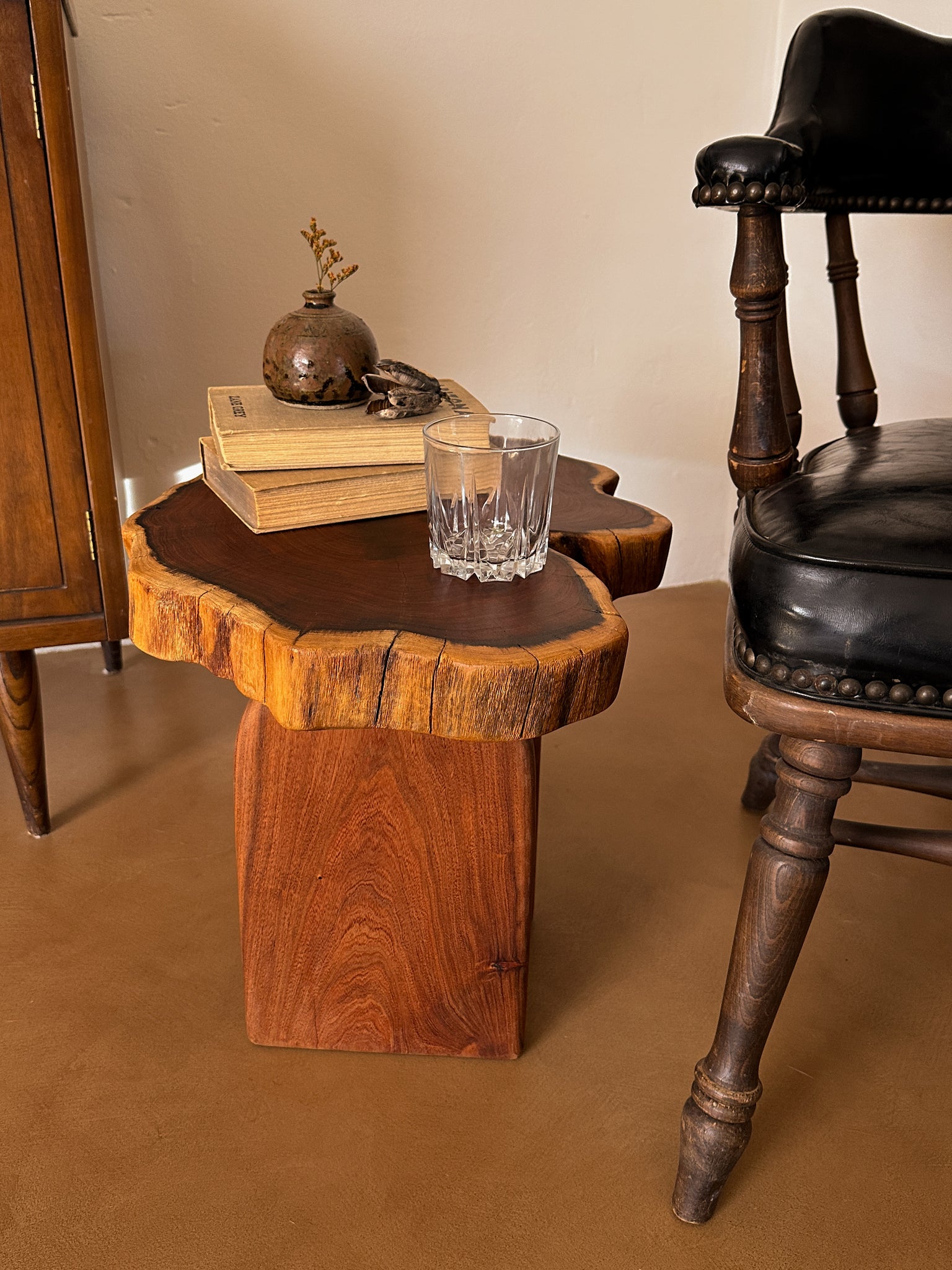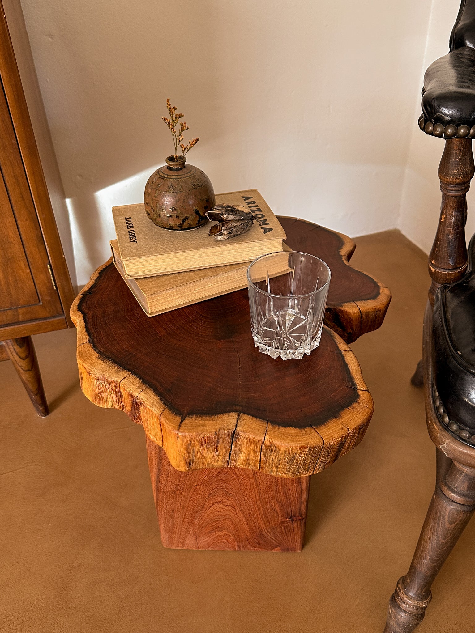 A hand crafted side table made of locally sourced mesquite. We designed modern arched legs to complement the natural curves of the live edge top. A shorter option to pair with your favorite chair to enjoy your morning coffee or evening cocktail. We love the idea of a layered look with this short-y!