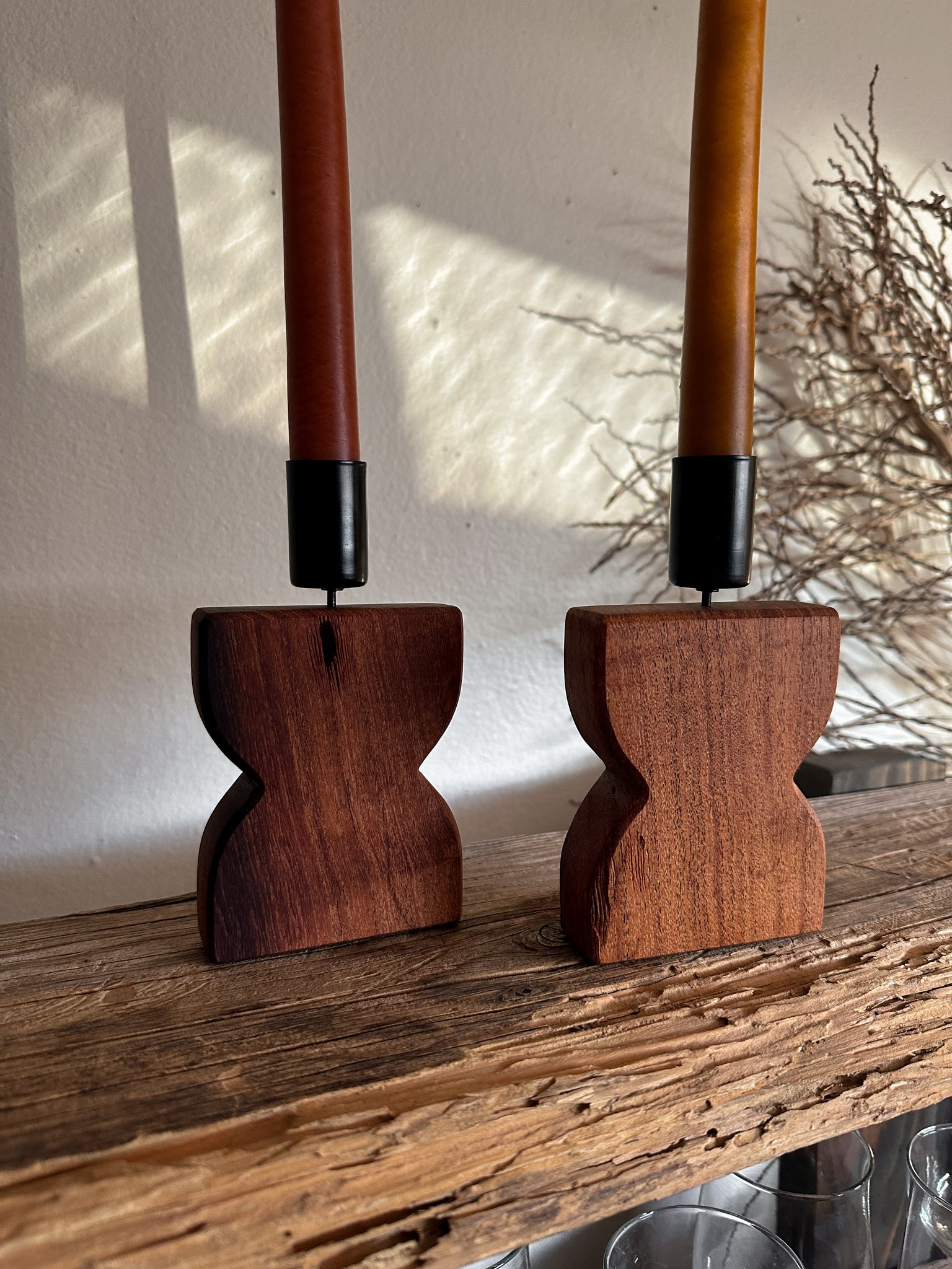 A handcrafted tapered candle holder made of locally sourced mesquite wood. The candle holder features a modern geometric silhouette.
