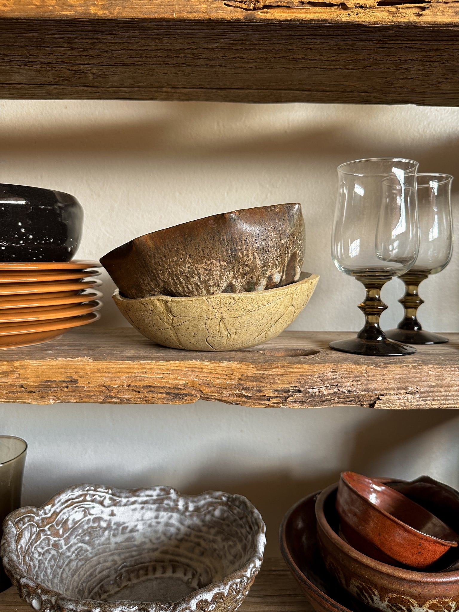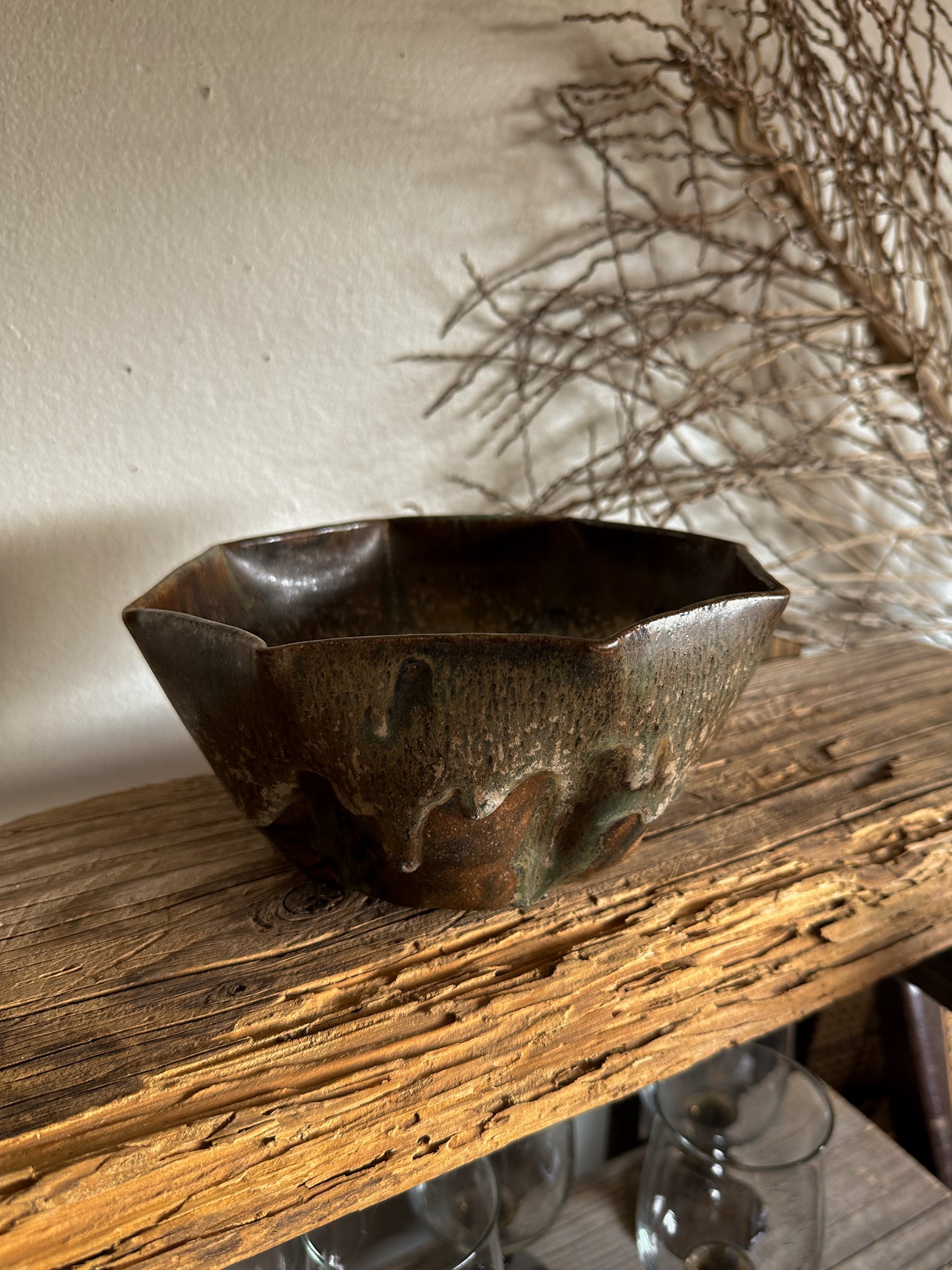 A beautiful pottery bowl that has been hand formed into this unique shape. A thick layer of brown & green glaze adds depth and texture. Perfect bowl to use decoratively or as a serving bowl in the kitchen.