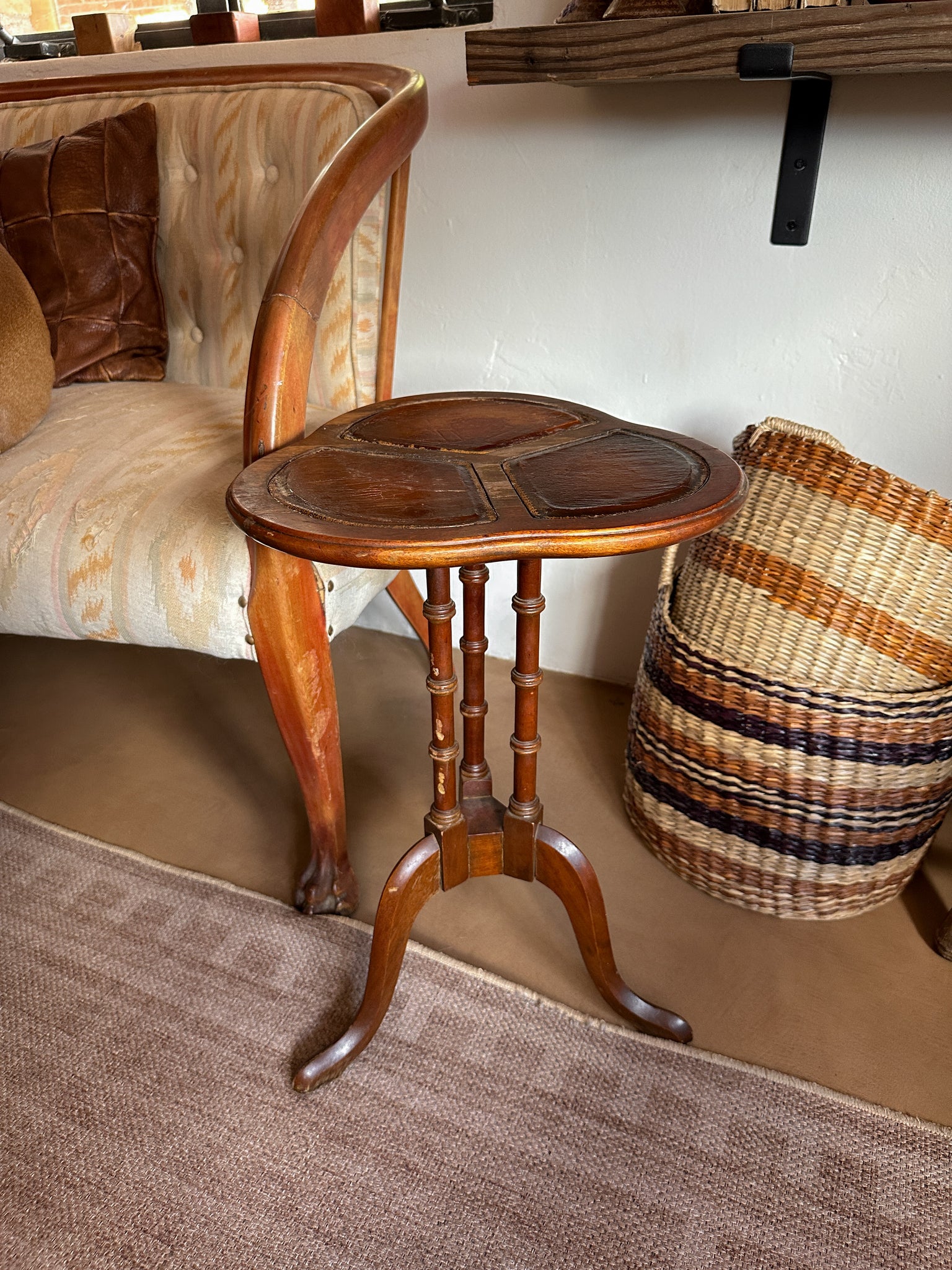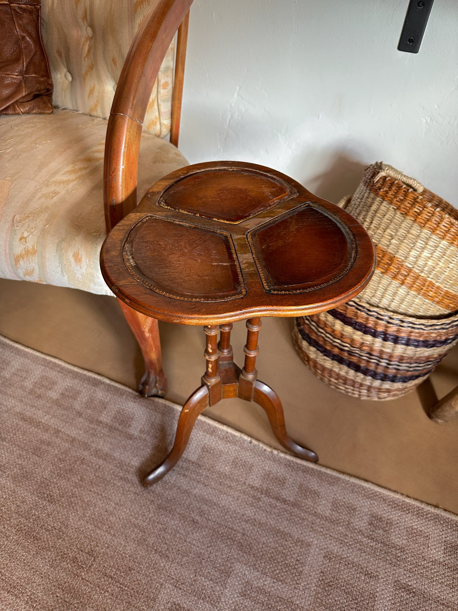 This is small elegant side table made of Mahogany with a tooled leather top in the shape of three clover leaves. The leather is gorgeously worn with a gold scrollwork design along the edges. A beautiful small piece of furniture to add to an entryway, hall, or library. The leather has been treated with professional leather cleaner.