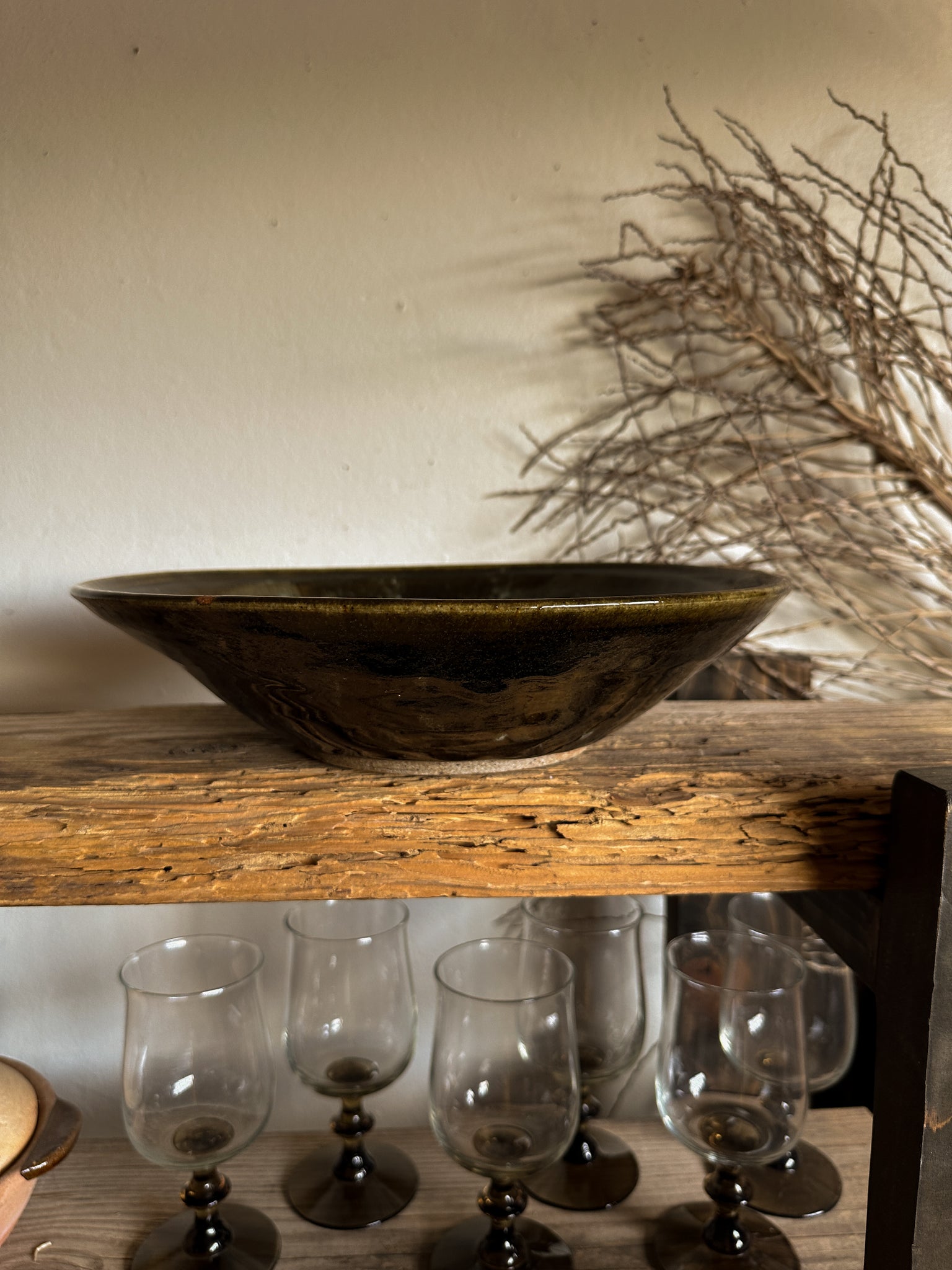 A stunning hand turned bowl finished in a moody green glaze with some white drippy effect on the inside. A great bowl to use for citrus on your counter or to serve up salads & pastas. Signed by the maker on the bottom.
