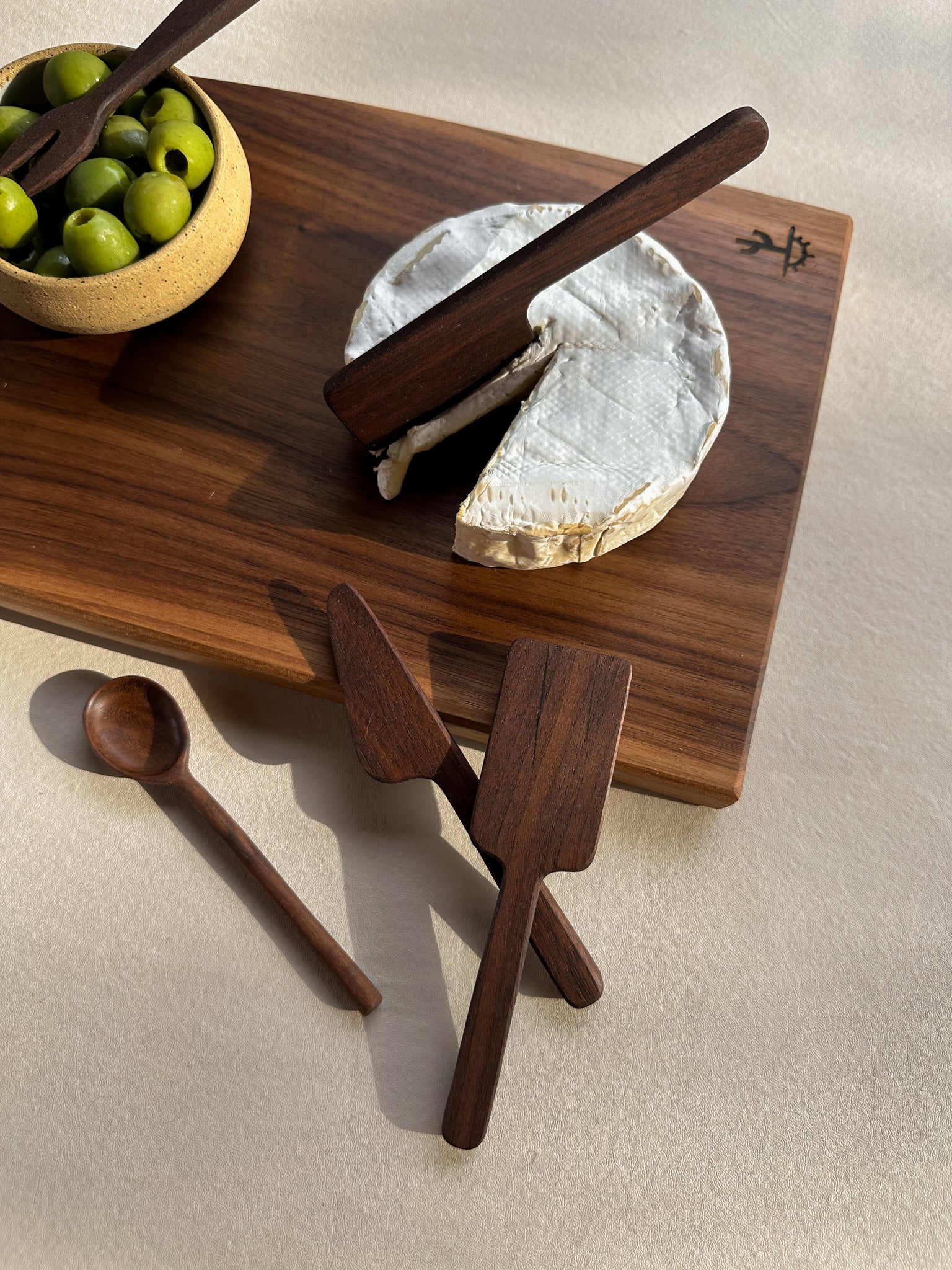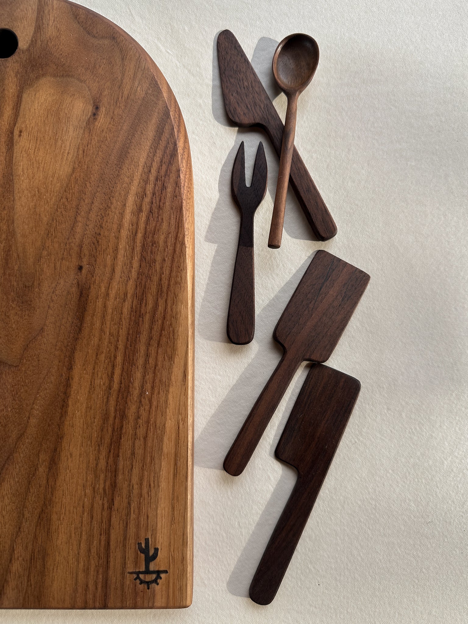 Everything you need to serve a stunning grazing board right here. This is a hand crafted walnut set including an arched style board, a cocktail fork, a spoon & three cheese slicers.